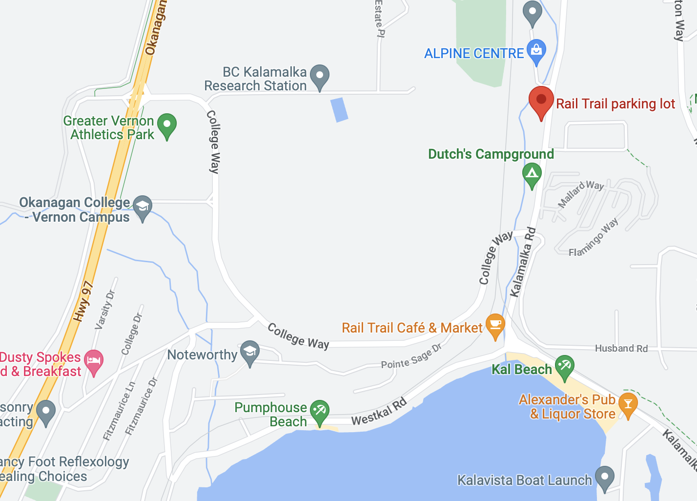 As shown on map above parking is at Coldstream Station “ Rail Trail parking lot” which is beside Sun Country Cycle bike shop on Kalamalka Road.